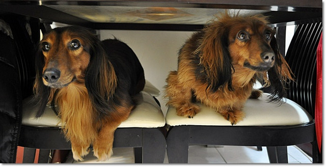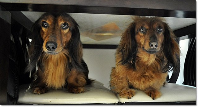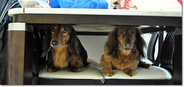 叫了他們才發現他們一起躲在餐桌下面呢