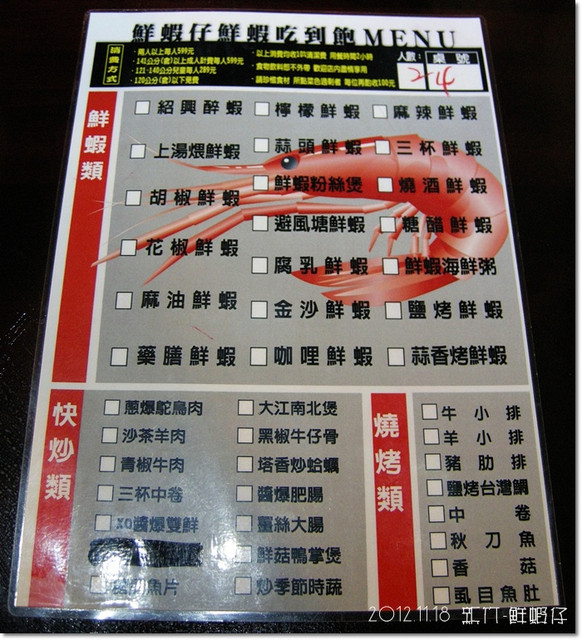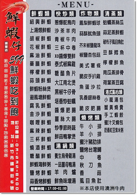 菜單正面,是主要的鮮蝦吃到飽菜單