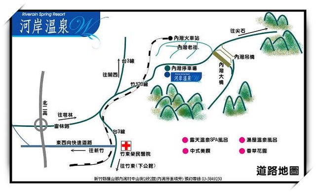 從美麗山水和老舊情懷,〔河岸溫泉〕以複式經營的現代企業概念下,結合溫泉風呂、中式美饌與香草花園的河畔景點,讓內灣之美多了泡湯閒情,〔河岸溫泉〕也豐富了內灣美貌。