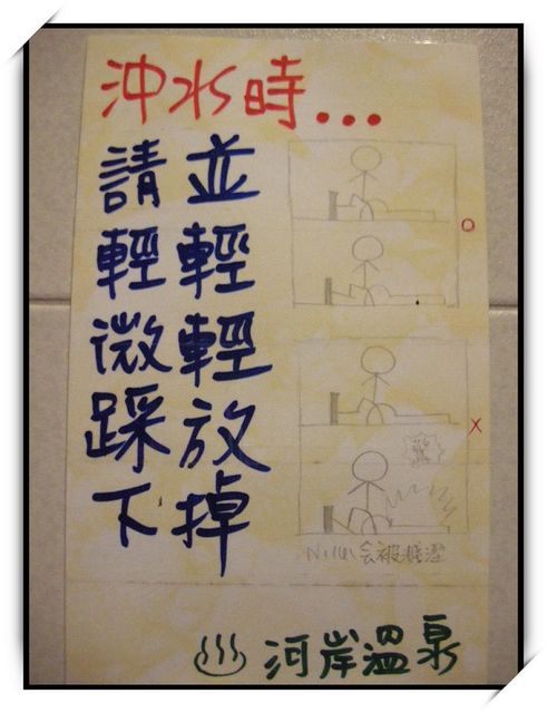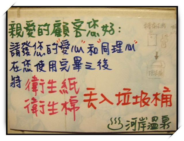 〔河岸溫泉〕私人擁有的溫泉泉源,在各項溫泉設施使用上皆採全程嚴密控管,除了避免回收使用上的顧慮,在養身衛生上更是比一般自然湧泉可能接觸外在汙染來的令人安心。