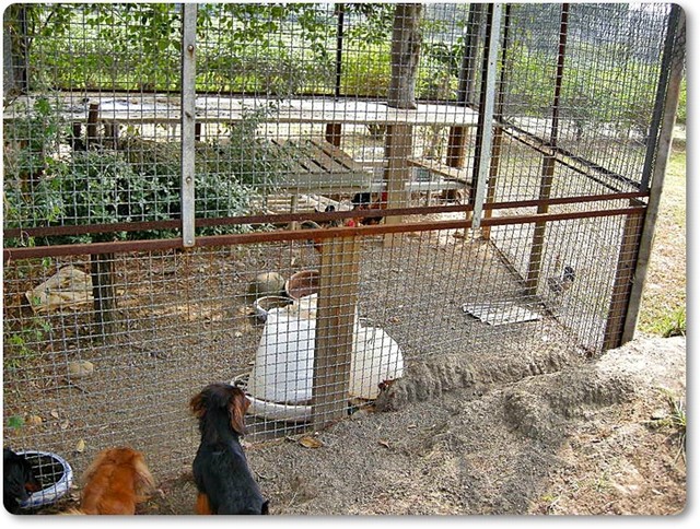 這塊草皮的旁邊,有個大雞籠,裡面養了不少的雞