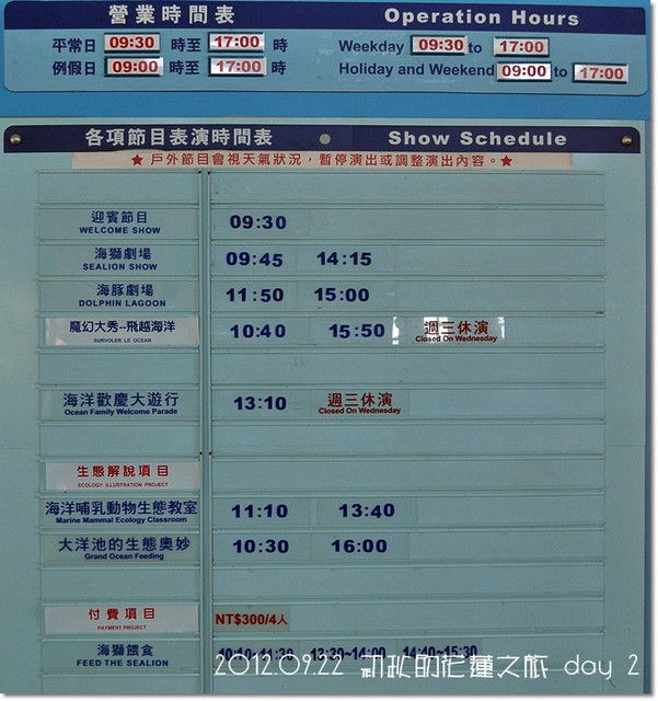 以上這2個表很重要,因為海洋公園下午5:00就關園了...