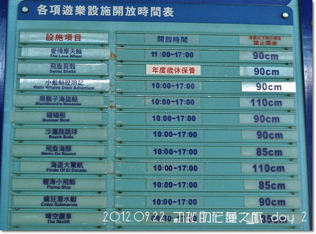 還有各項遊樂設施的的開放時間表