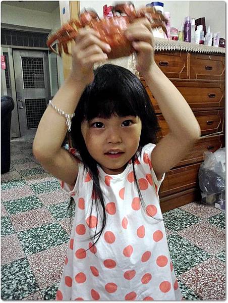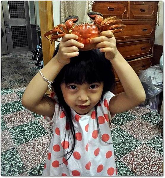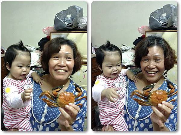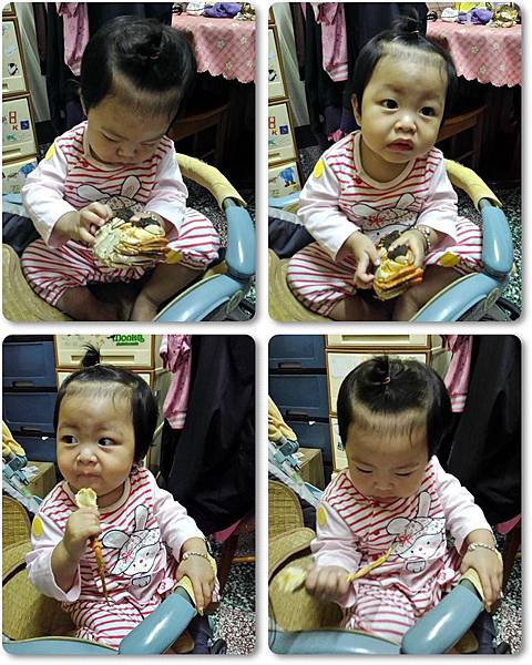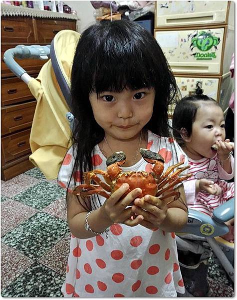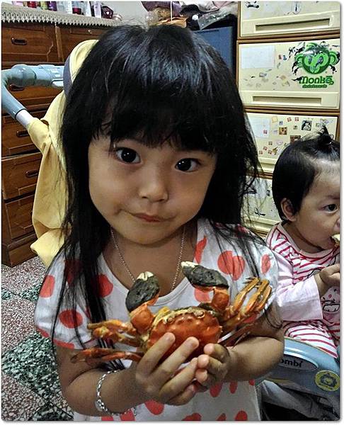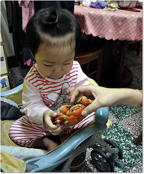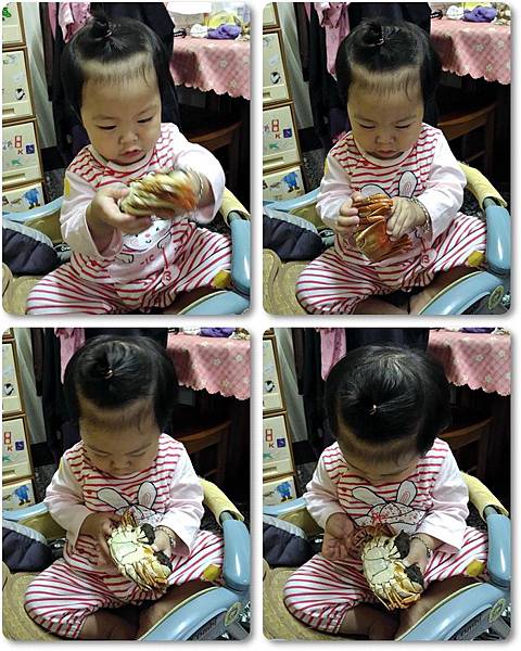 後來麻咪乾脆給她一隻蟹腳把玩,順便吸點蟹肉