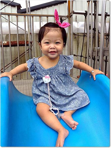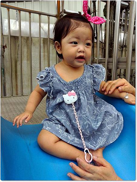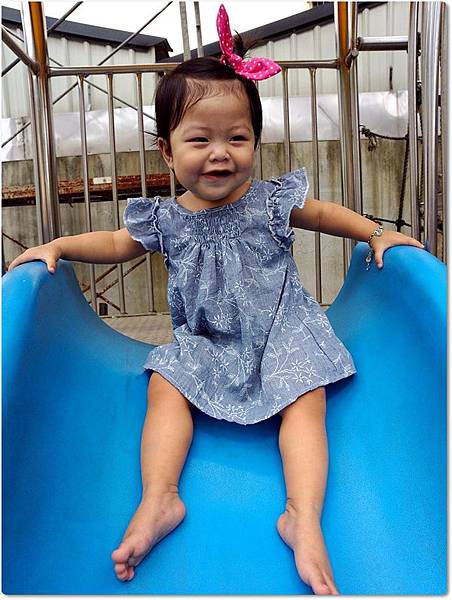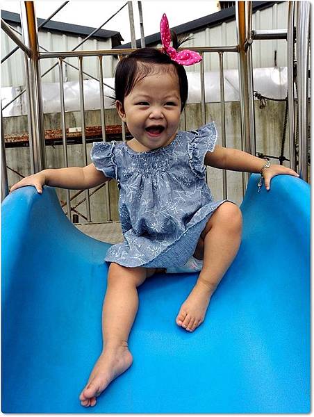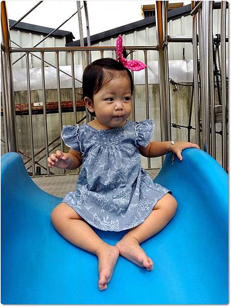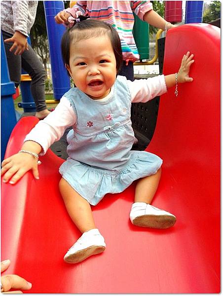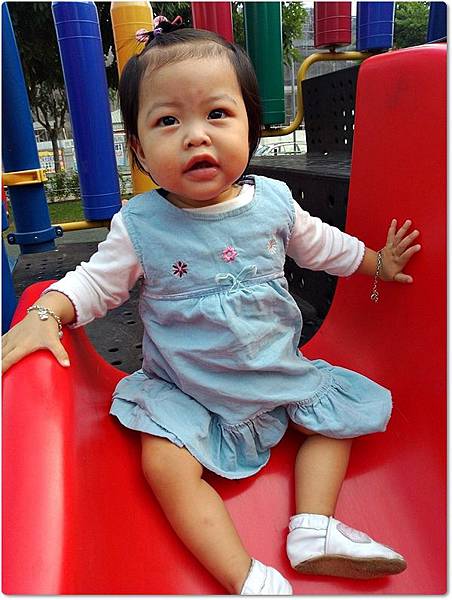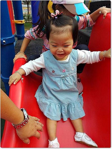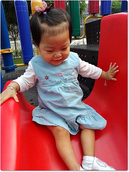 妞妞膽子真的比較大,姐姐陪她溜幾次後,再抱她上去等姐姐時就一直想要自己溜下去了