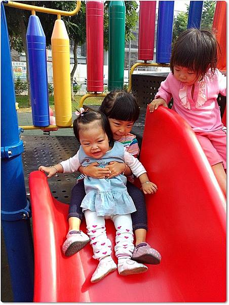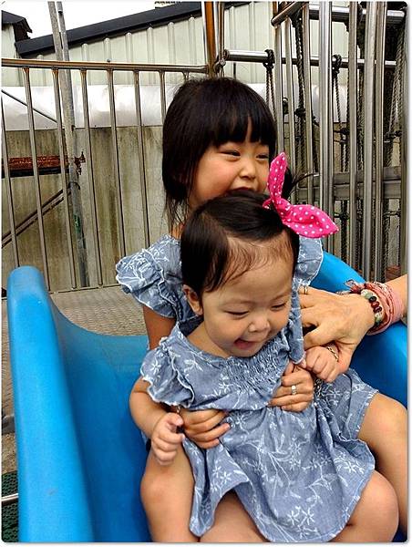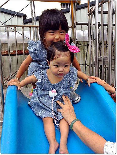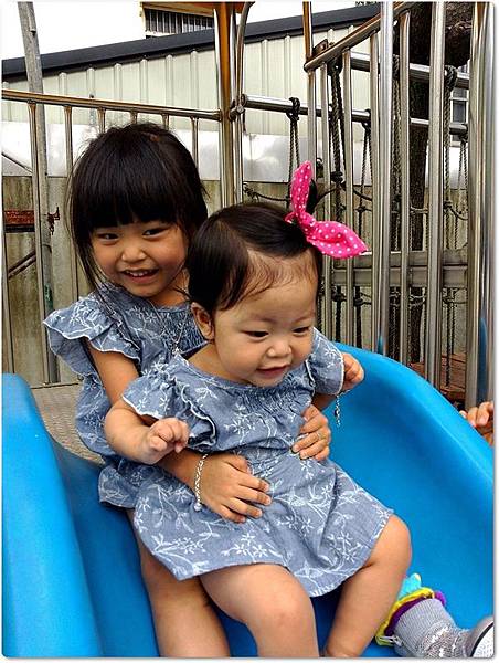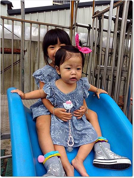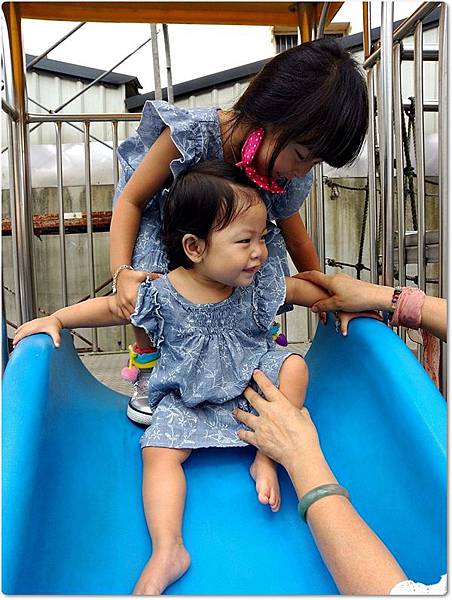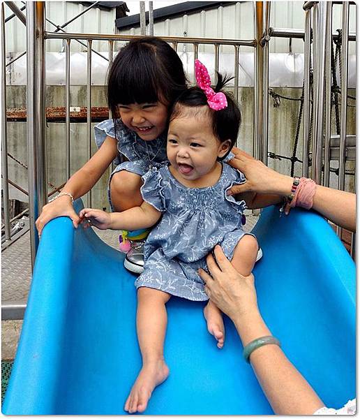 姐姐在玩溜滑梯,有帶妹妹一起溜喔...