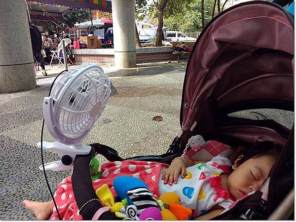 到了後只能睡推車囉,天氣有點熱,還幫她架起久違的電扇(畢竟現在都秋天了嘛)
