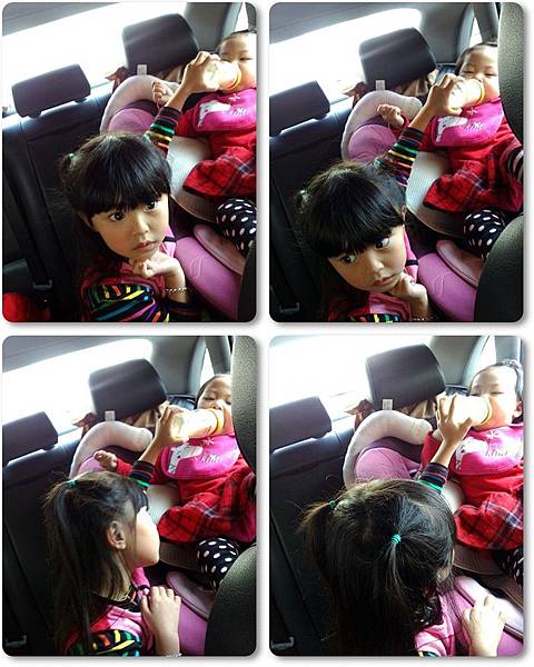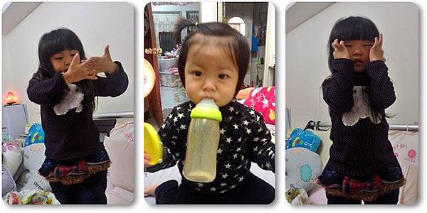 這時妞妞喝奶不自己手拿,還要姐姐在一旁餵她