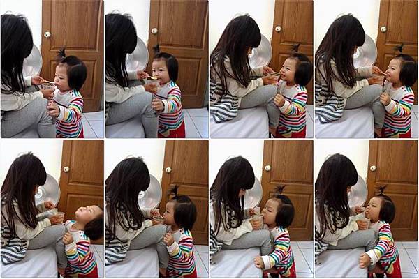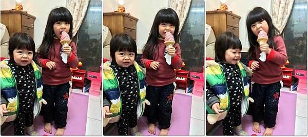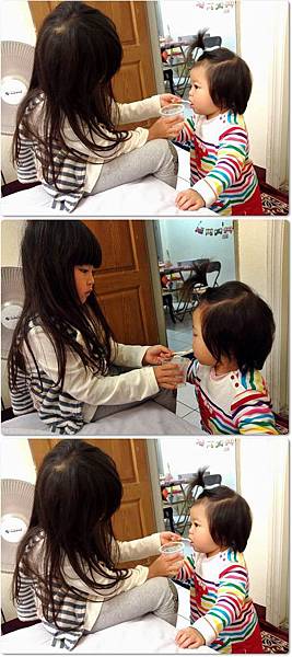 姐姐在吃布丁,貪吃的妹妹也吵著要吃,所以姐姐就餵妹妹吃一點囉