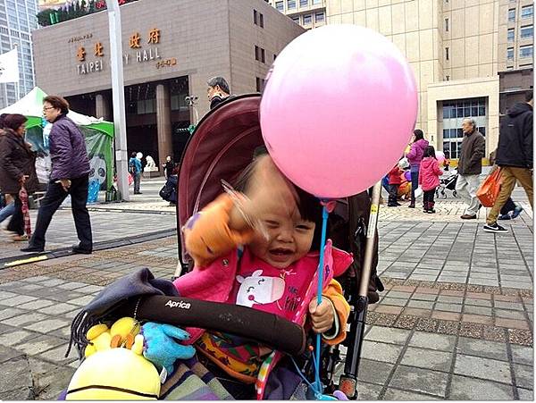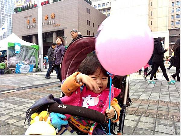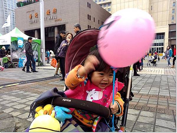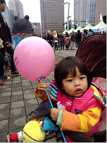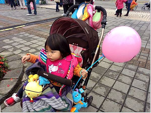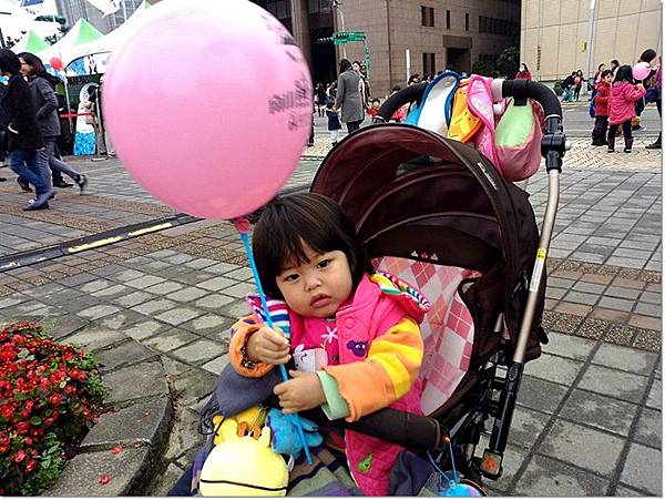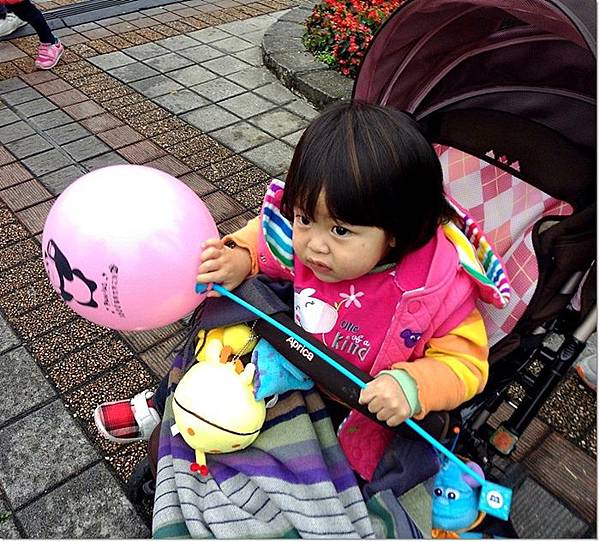 姐姐跟麻咪去拍照,妞妞跟我在這排隊,自個兒玩氣球玩的很high ◕‿-