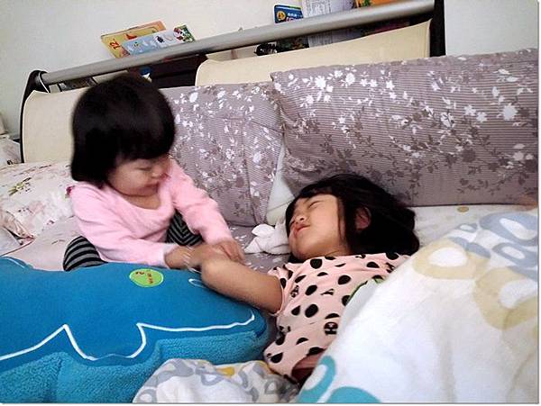 溫馨的是當妞妞作夢唉唉叫時,姐姐就會主動伸手過去抱抱她或拍拍她,很棒