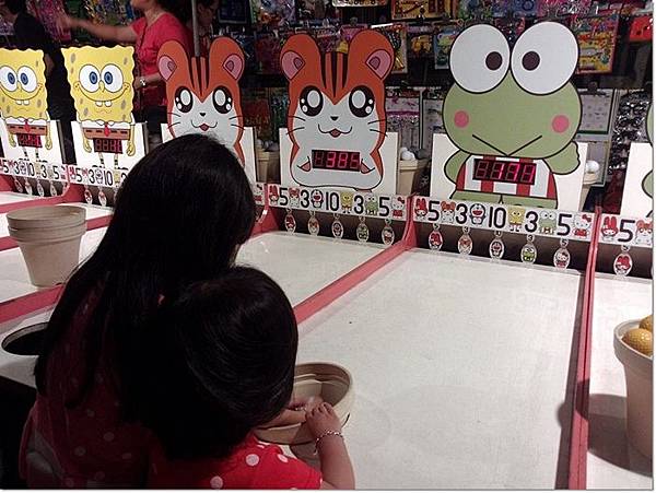 今天去逛竹東夜市,麻咪答應讓她們玩一次夜市的滾球遊戲