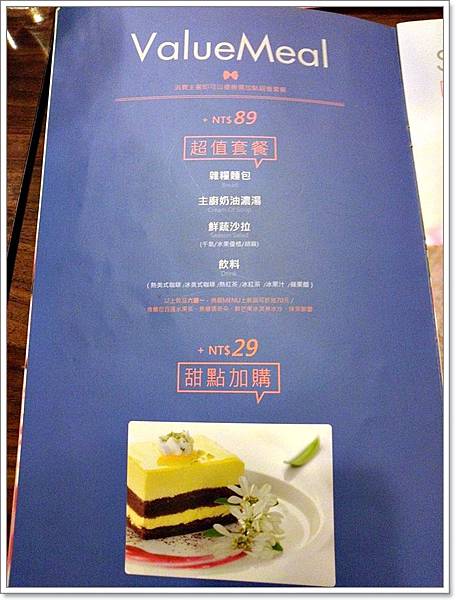 套餐是+$89,有飲料,麵包,生菜沙拉還有濃湯