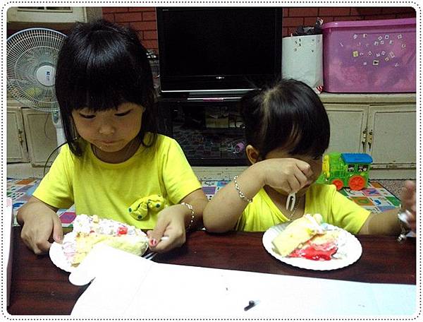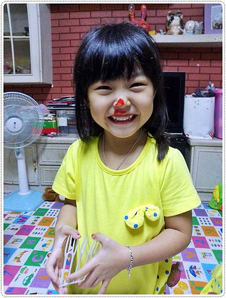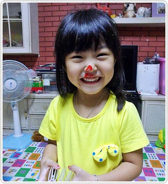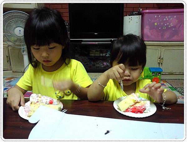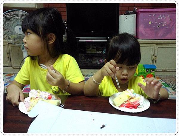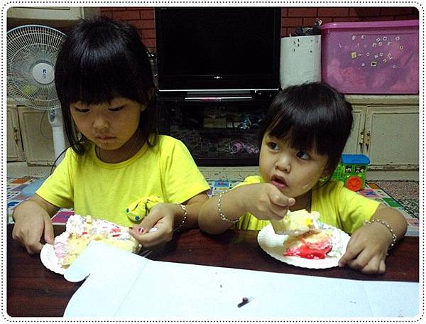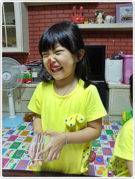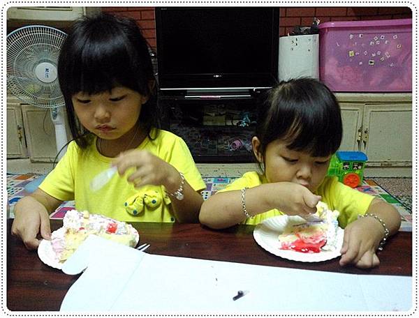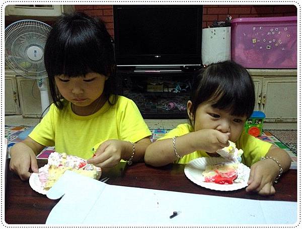 姨婆"很不小心的"把蛋糕上的草莓醬沾到紜姐姐的臉上了 ~( ̄▽ ̄)~*