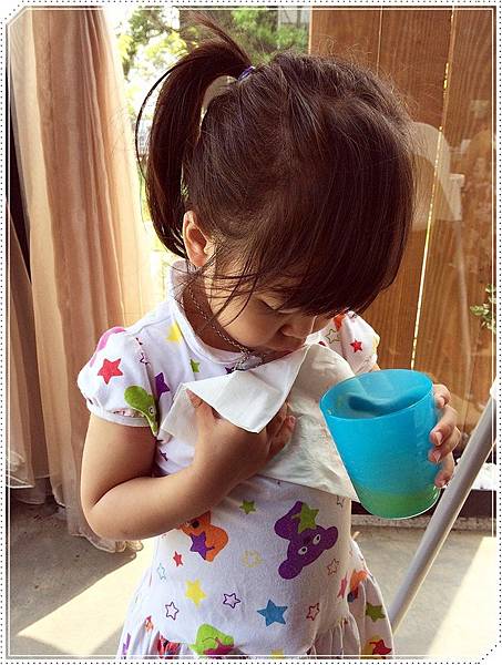 她今天穿白衣服,喝飲料的時候還知道要拿東西墊著,避免弄髒...