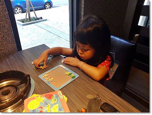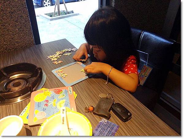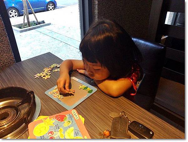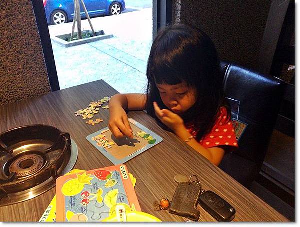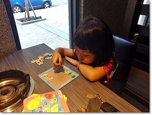妞妞在一旁一邊玩她帶來的拼圖一邊等我煮她要吃的麵麵