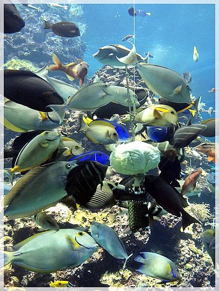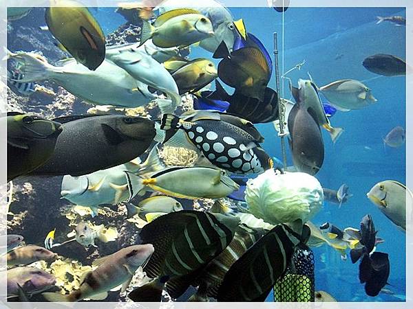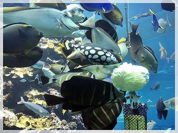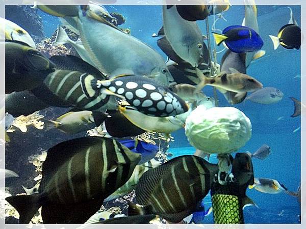 一整顆高麗菜就這樣綁著掉在那讓魚群自行啄食![]()