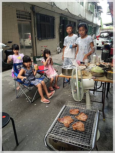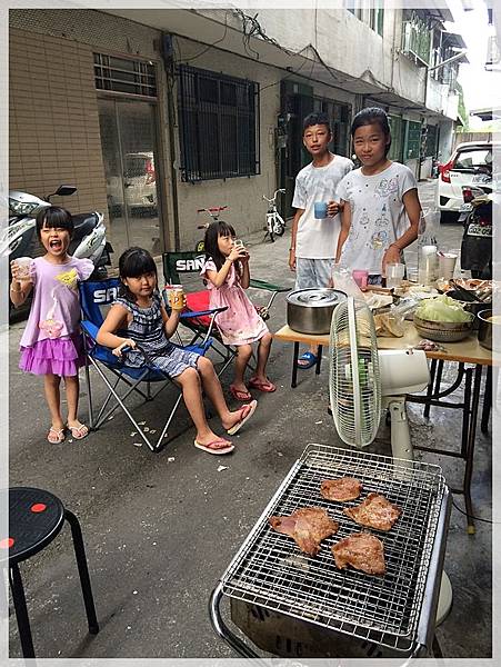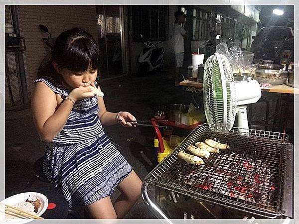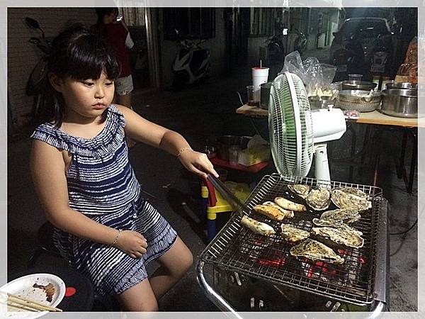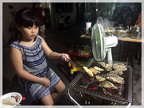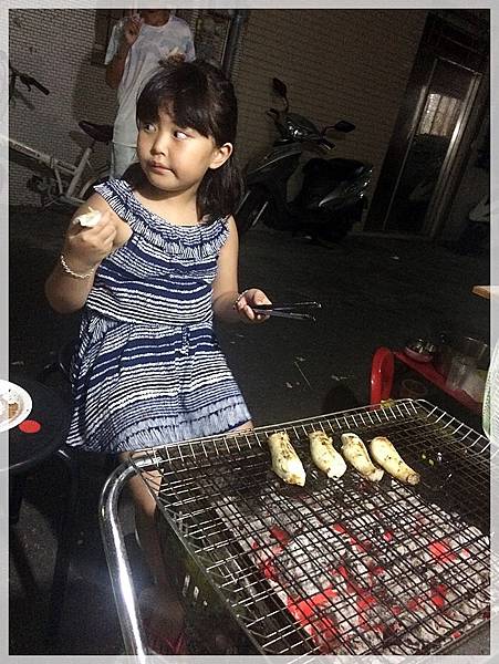 所以等她吃飽玩累了,就讓她坐下來幫我們烤東西吃