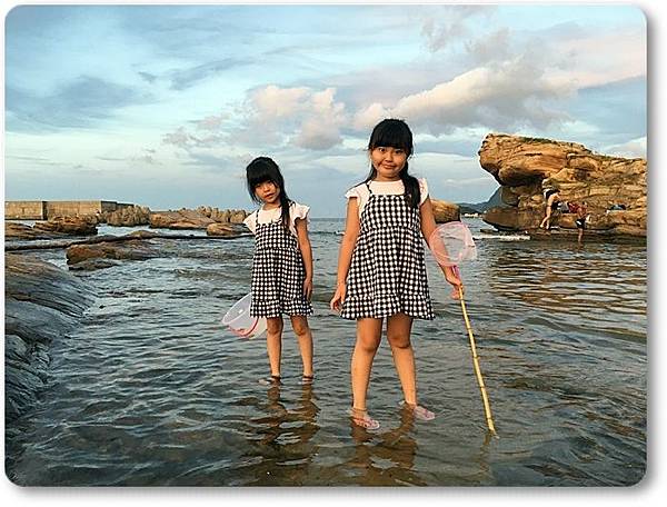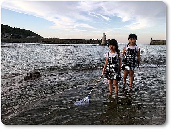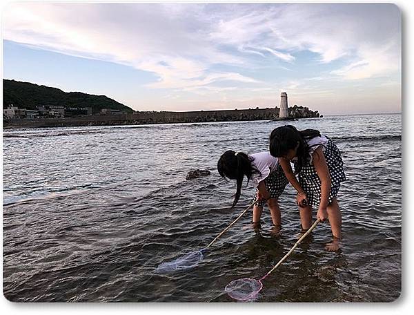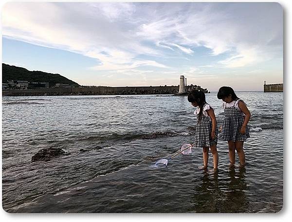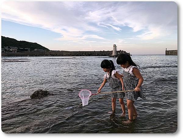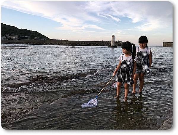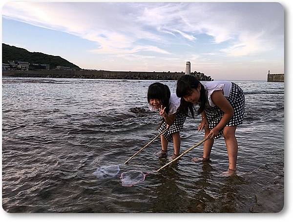 兩個小朋友拿著魚網在海邊撈魚...